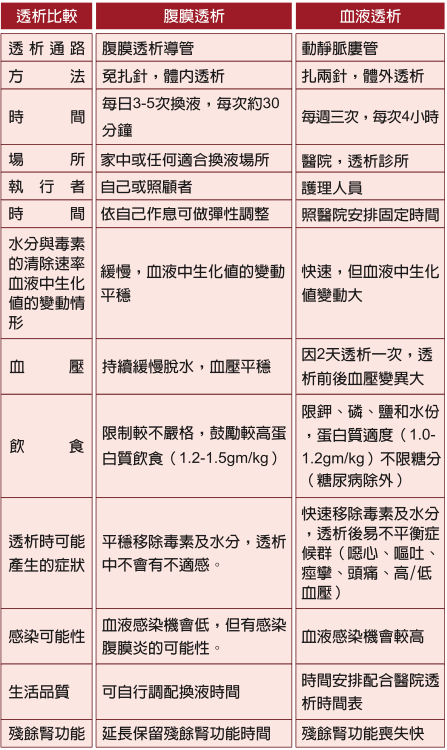雖然是兩種不同的透析方式,但都是使用半透膜來過濾血中的廢物。腹膜透析或血液透析的存活率究竟是何者較高,目前仍未定論,透析方式的選擇主要是依患者的個人喜好、家庭支持度及本身其他疾病而定。隨著透析技術與治療的進步,長期透析者不但存活率更高,更重要的是生活品質也較為提升、甚至有不少患者可以回到工作崗位。